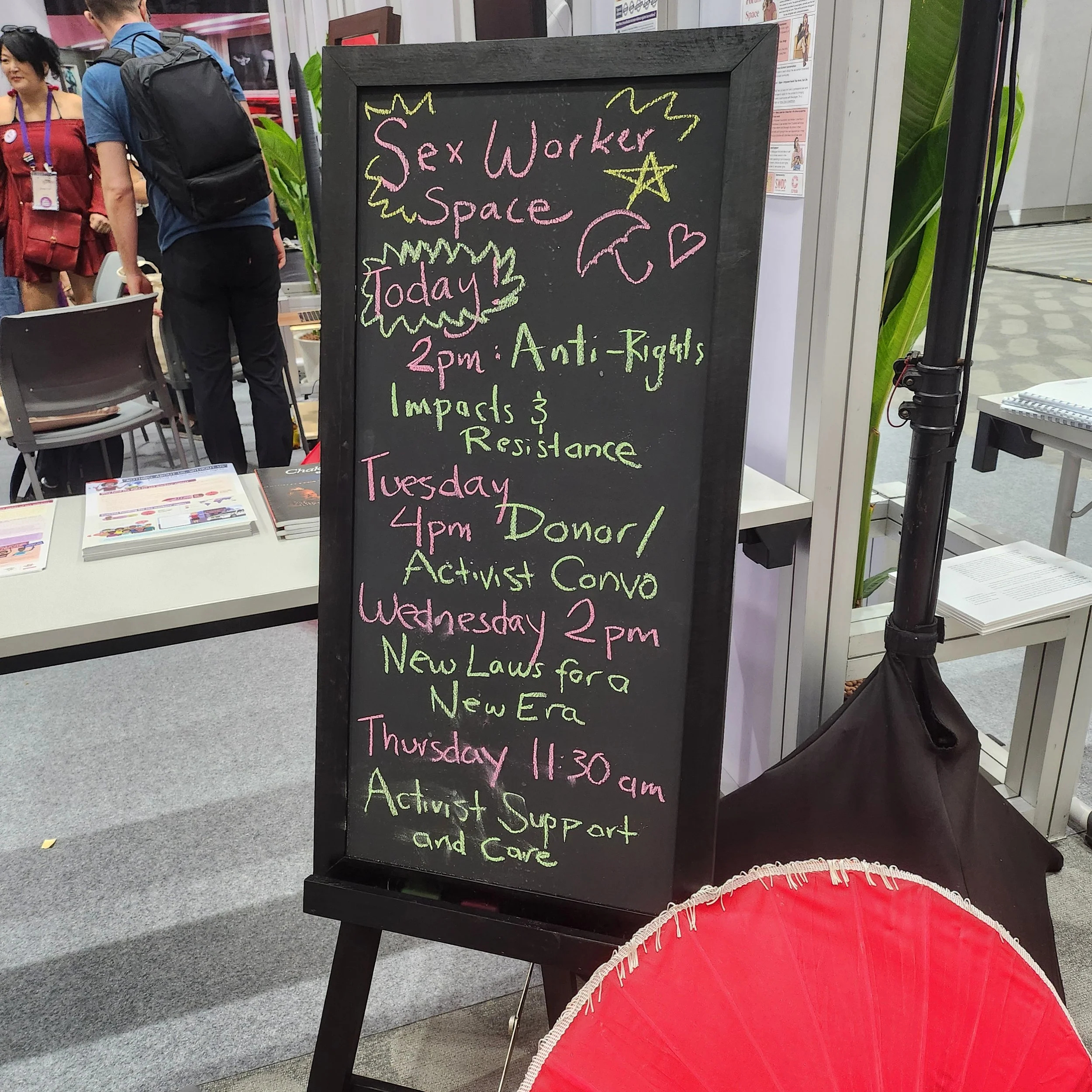 Chalkboard outside Sex Worker Networking Space at AWID 2024, with schedule of events “Sex Workers Space. Today, 2pm Anti-rights Impacts & Resistance, Tuesday 4pm Donor/Activist Convo, Wednesday 2pm New Laws for a New Era, Thursday 11:30 am Activist Support & Care.